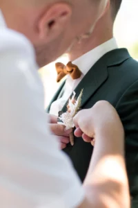 Au programme : une installation florale avec une arche de cérémonie en extérieur, des bouquets accrochés le long des chaises de l’allée centrale, et des tables sobrement décorées de trios de soliflores. Sans oublier le bouquet de la mariée et les accessoires.
